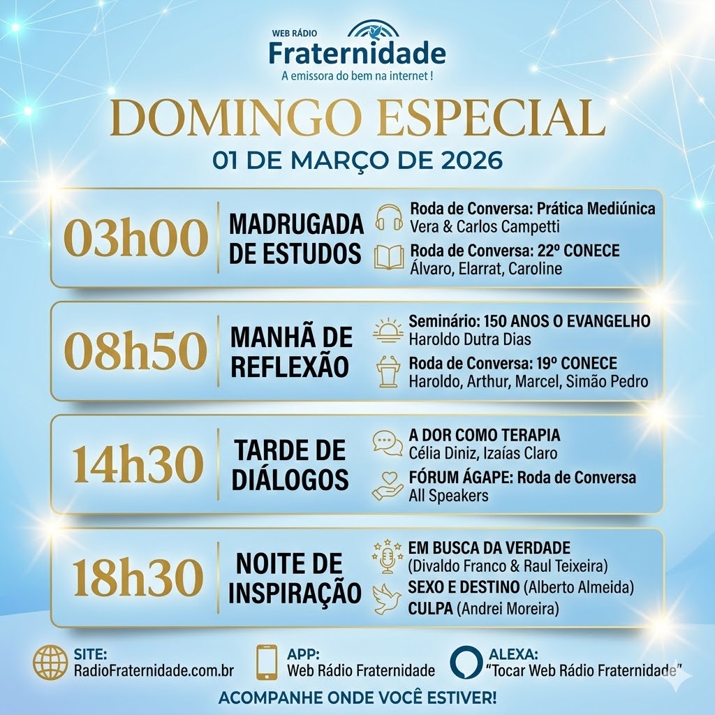 A Web Rádio Fraternidade apresenta mais uma edição do Domingo Especial, reunindo grandes momentos do movimento espírita nacional em uma programação cuidadosamente selecionada.